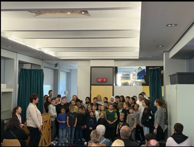 Am Donnerstag, den 18.9.2025 begrüßten wir die Erstklässler mit einer Feier. Die Grundstufe führte ein Theaterstück von der kleinen Raupe Nimmersatt auf und auch der neu gegründete Schulchor unter der Leitung von Frau Sonnek sang ein Lied. Anschließend besuchten die Erstklässler ihre erste Schulstunde in der G1. Die Eltern durften sich an einem reichhaltigen Buffet stärken. welches die Mädchen der Hauptstufe hergestellt hatten.